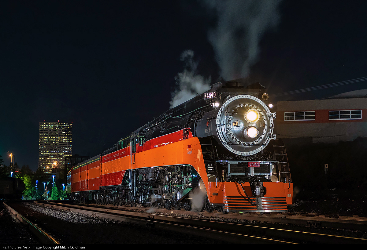 Owned by the City of Portland and maintained by a group of dedicated volunteers named "Friends of SP 4449", this 1941 built 4-8-4 Lima Locomotive Works locomotive performed a number of runbys in the yard adjacent to the Oregon Rail Heritage Center in October, 2018 for a night photo session sponsored by Lerro Productions.