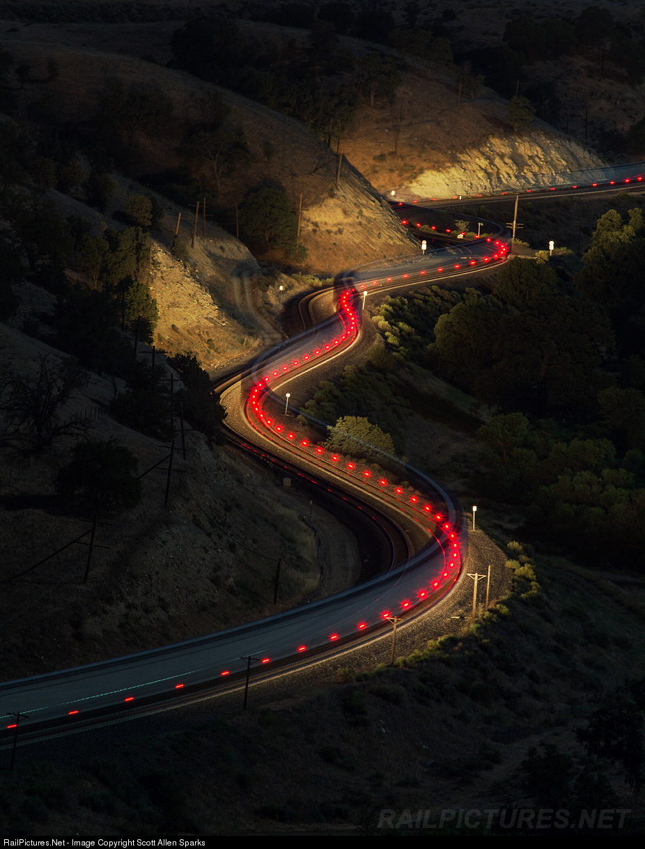 | Cable’s twisting curves are lit by a southbound BNSF grain train’s headlights as it climbs the grueling Tehachapi grade, only a few miles from the mountain’s summit in eastern Tehachapi, CA. |