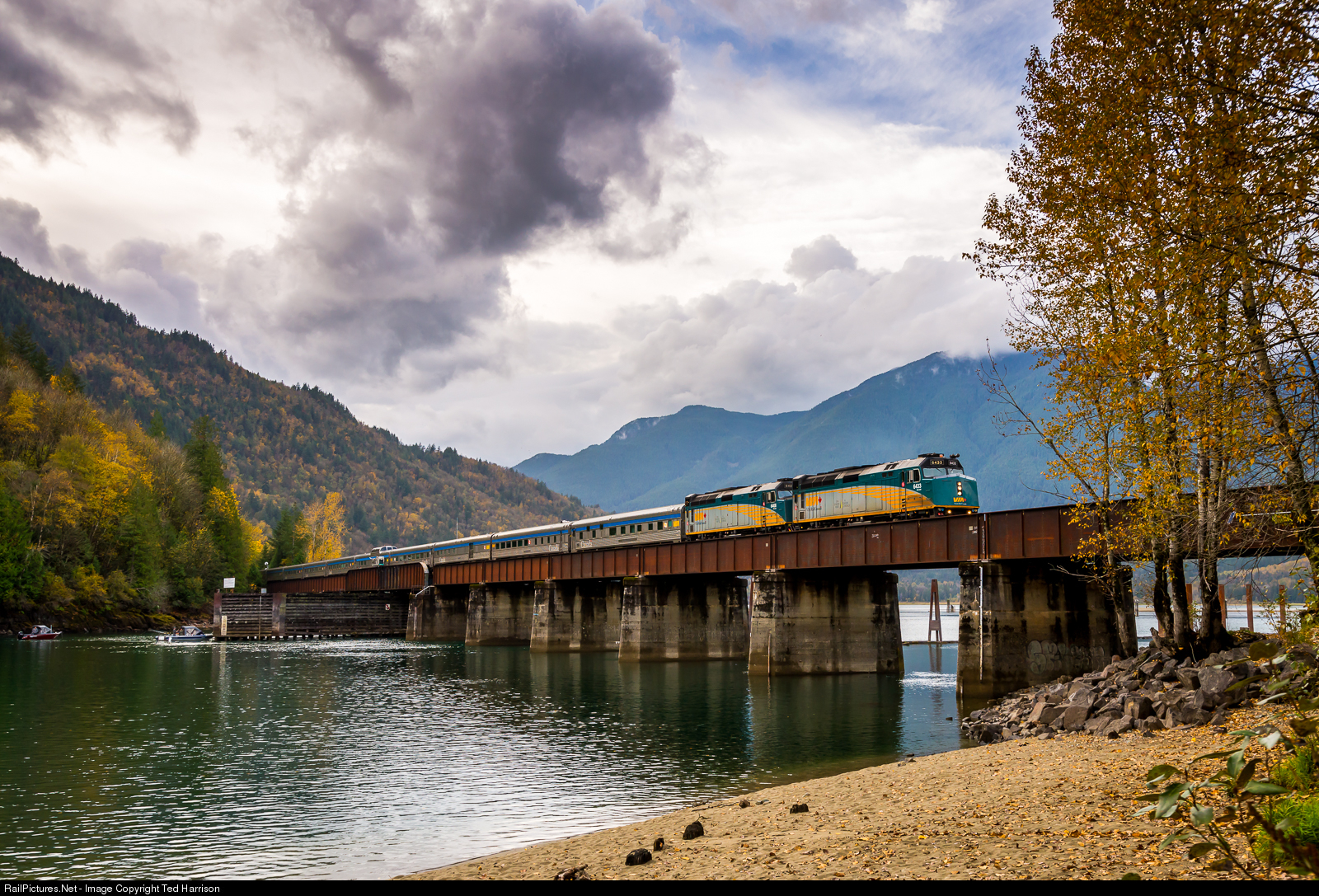 | VIA 2, "The Canadian," crosses the Harrison River outside of Agassiz, BC on a cool fall afternoon. |