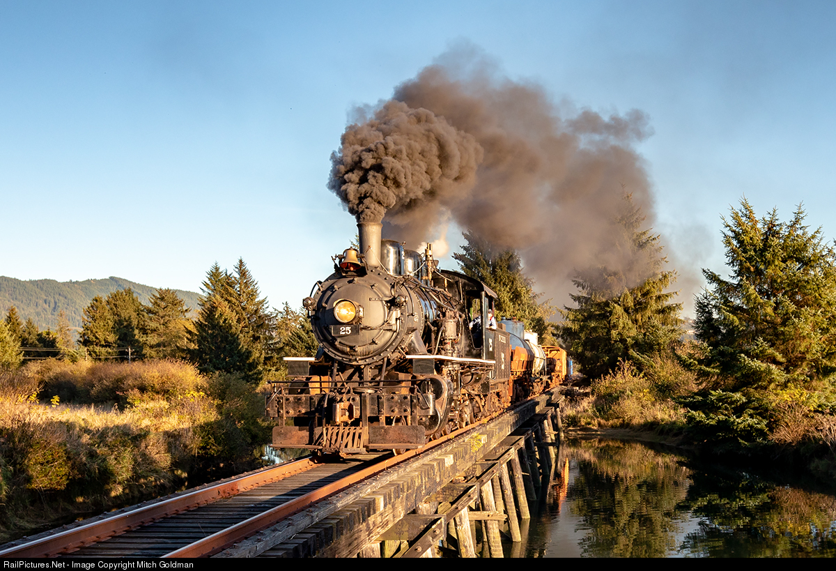 | McCloud River Railroad 2-6-2 No. 25 leads a freight consist over the wooden trestle along the former Southern Pacific branch of the Oregon Coast Scene Railroad at Idaville, OR. Part of a Lerro Productions charter. |