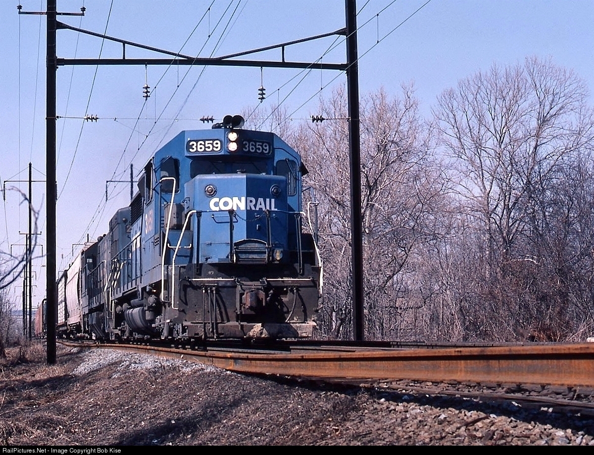 | This ex-EL GP35 looks like it's switching onto a roller coaster track, as it heads east on the old PRR Atglen & Susquehanna, which Conrail was rebuilding with welded rail at the time. No. 3659 was built in 1964 as the Erie-Lackawanna's No. 2553. |