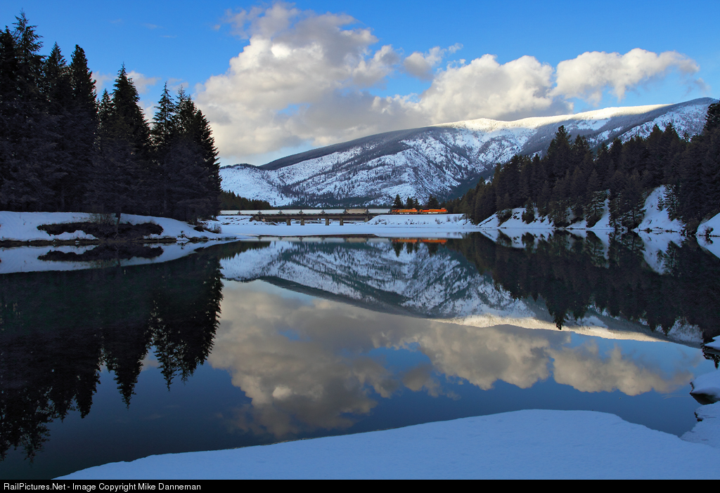 5:24 p.m. on a tranquil winter evening at Trout Creek, Montana, sees an eastbound BNSF grain train reflecting in the open waters of where Trout Creek flows into the Clark Fork, ending another nice day of photography on Montana Rail Link’s Fourth Subdivision.