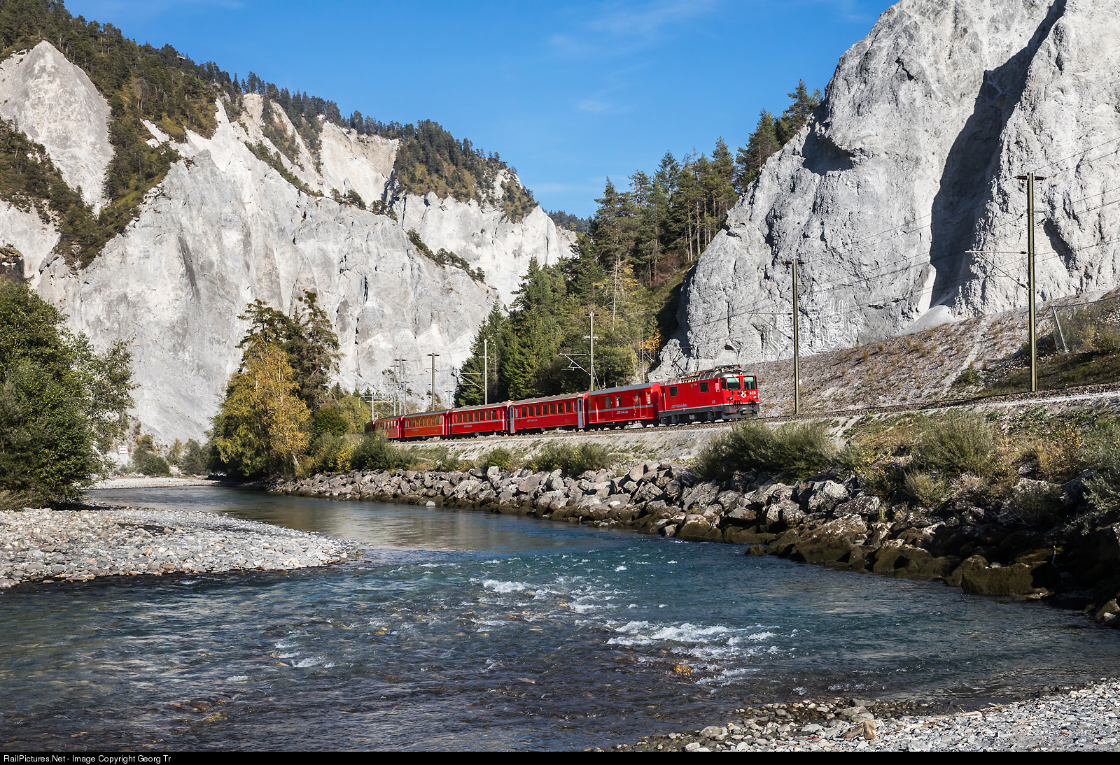 Ge 4/4 II # 628 "S-chanf" is pulling Regio Express 1753 from (Scuol-Tarasp-) Landquart via Chur-Ilanz to Disentis through the impressive gorge of the Vorderrhein, called Ruinaulta. On the right of the locomotive, you can see a drawing on the rock face. It is a land art work of the "Art Safiental", made by artist Analia Saban (Arg/USA). Text from Art Safiental: "Analia Saban‘s wall-work refers to prehistoric rock and cave paintings, which could be seen as early forerunners of Land Art. She covers the rock walls at Versam-Safien