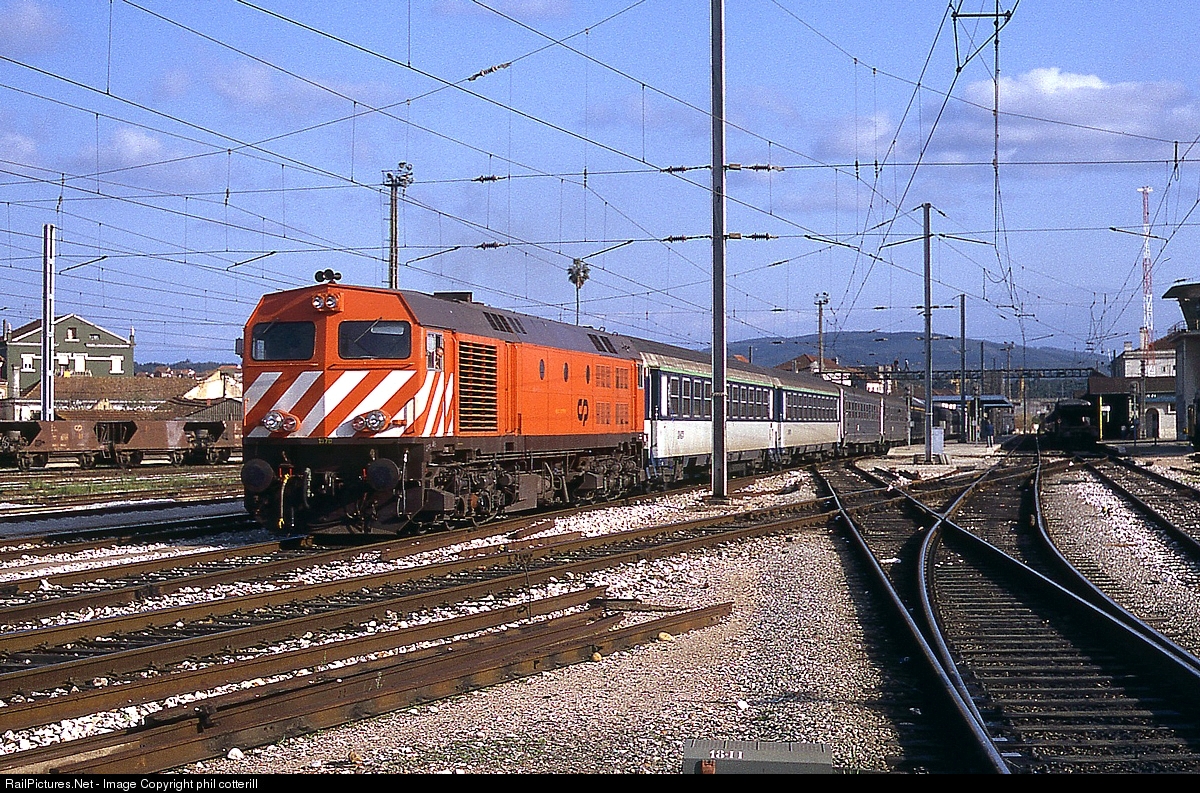 | Loco 1970, built in Montreal in 1979, leaves Pampilhosa with a passenger train in 1993. |