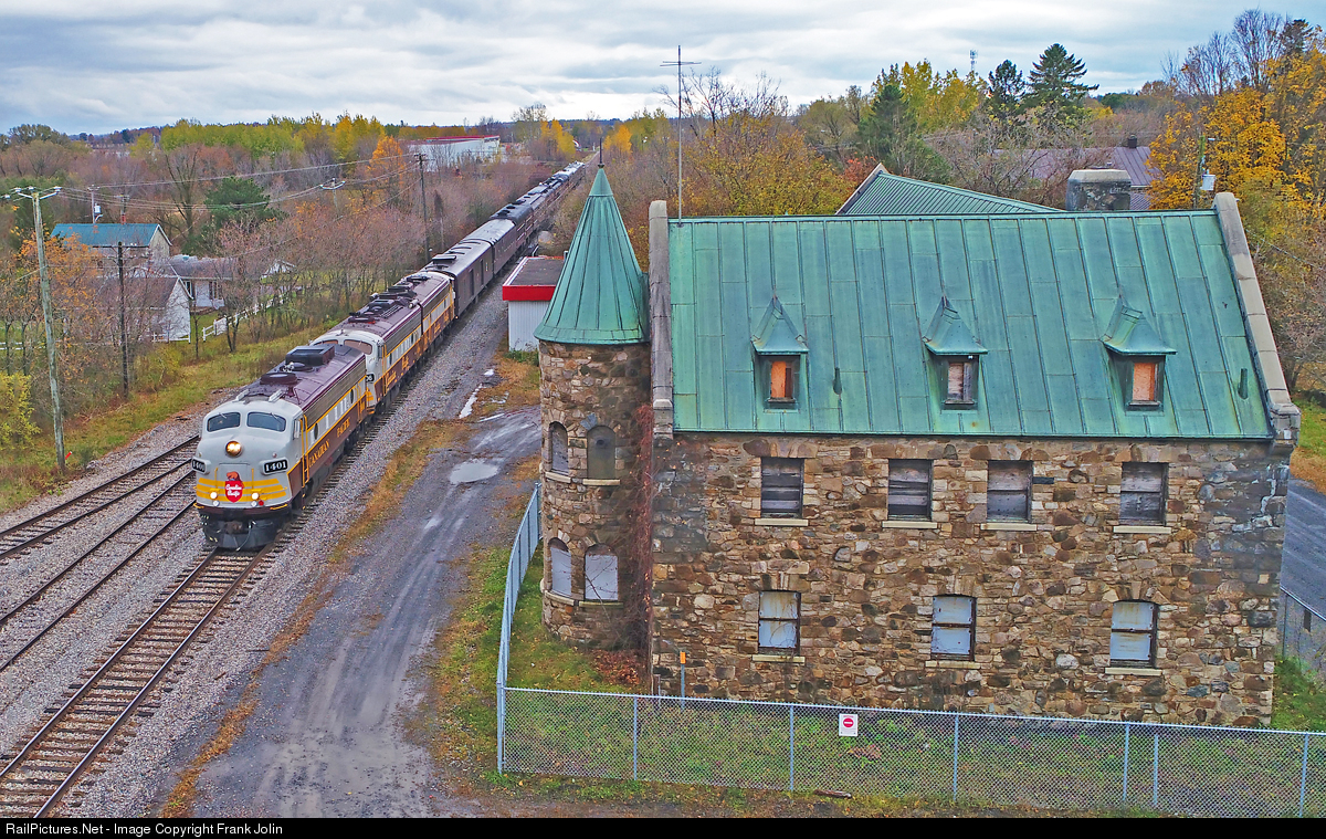 Originating in Albany NY, Royal Canadian Pacific 41B has just crossed into Canada as it passes by the old Napierville Junction Ry depot/Customs House at Lacolle. CP 1401 4106 4107 APU(Power Car) H.B Bowen, Banffshire, Crump, Royal Wentworth, Craigellachie, Mount Stephen, Assiniboine, Sam Steele, Bonfield, Sanford Fleeming