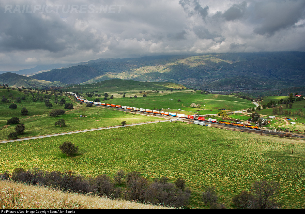 It's all business for this BNSF stack train working south, as 3 GE locomotives, facing elephant style, charge quickly up grade through Bealville under a drama filled sky. It's mid December and the hills were well underway with the annual greenery from the decent amount of rainfall that hit the Tehachapi hills in the weeks leading up to this December. Some miles behind by rail, lies the town of Caliente that can be seen down the mountain above the locomotives and is where the stacks passed through about 25 minutes before.
