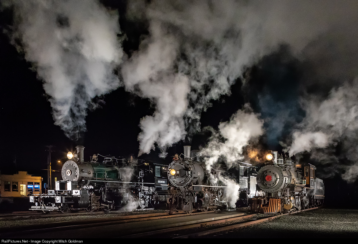 Columbia River Belt Line 2-4-4-2, "Skookum" (far left) shares the stage with McCloud River Railway #25 (center) and Polson Logging Co. #2 (far right) in a nighttime lineup of logging locomotives at the Oregon Coast Scenic Railroad in Garibaldi, OR. The 3-engine line-up occurred Friday night, October 19th, 2018 and was orchestrated by Lerro Productions.