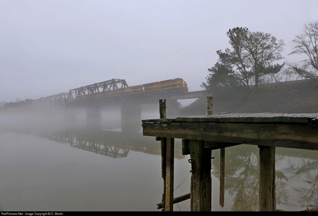 NS 339 zips through a moderate persisting fog as it scurries west across the Coosa River.