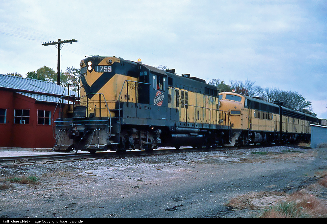 Chicago & North Western GP9 1759 in original paint scheme with a trio of former CGW "F"units (F3A, F7B and F3A) at Riceville, Iowa. Photo taken from my collection, no photographer name listed on slide.