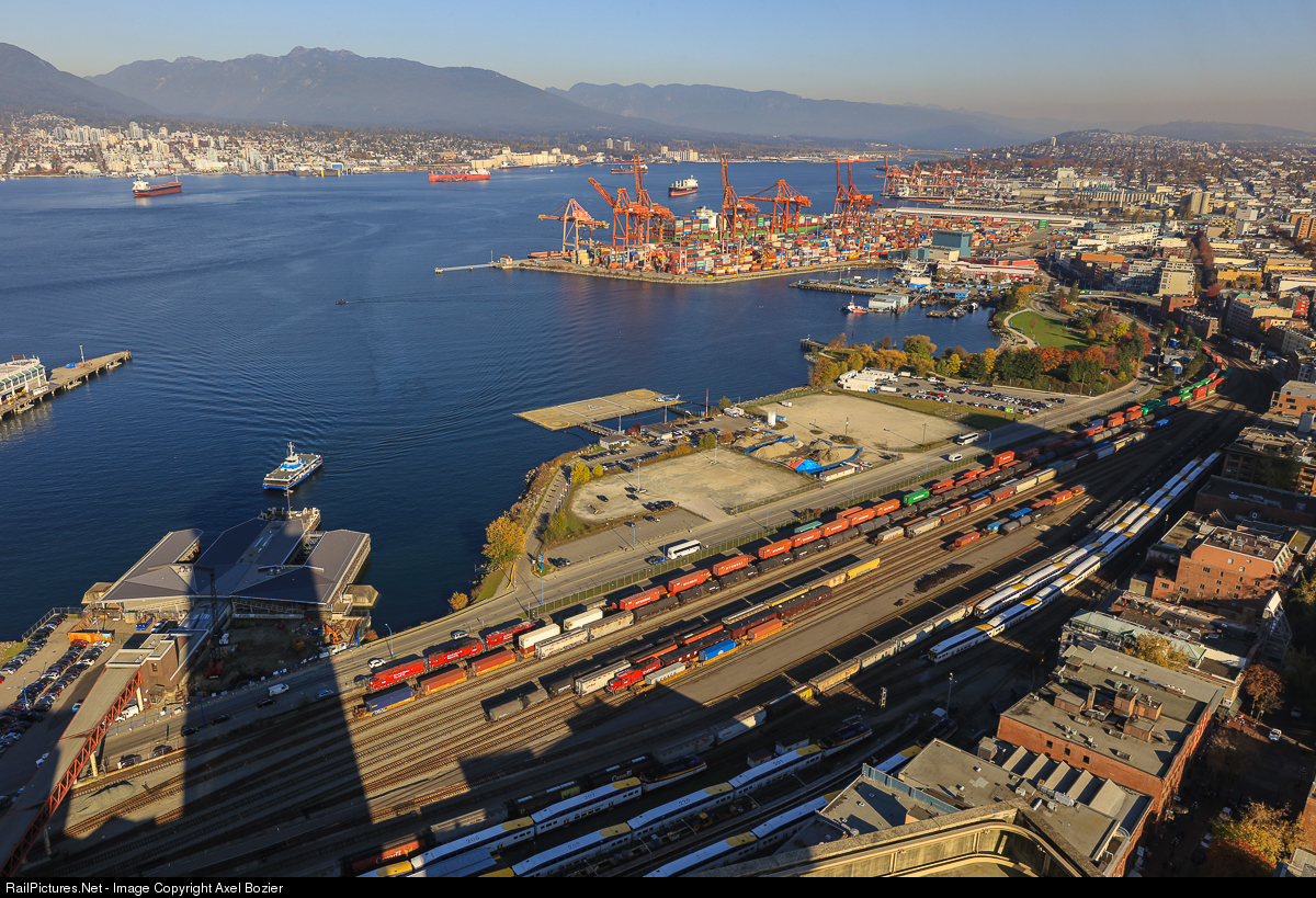 An aerial overview of the Port of Vancouver, with the Canadian National and Canadian Pacific rail facilities in the foreground. On the left, the shadow of the Harbour Center building from which this picture was taken.