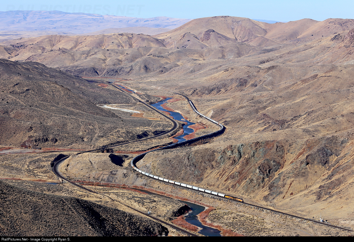 | Threading the Humboldt River in remote Palisade Canyon eastbound grain empties ride former Western Pacific iron en route to a crew change in Elko, Nevada. Coming in second place to lay rail through the Canyon WP shared the limited space along the Humboldt with the Southern Pacific, pairing their trackage to create a stretch of double track railroad (eastbounds on the WP and westbounds on the SP). Today the trackage through Palisade serves in the same capacity now under the sole ownership of the Union Pacific. |