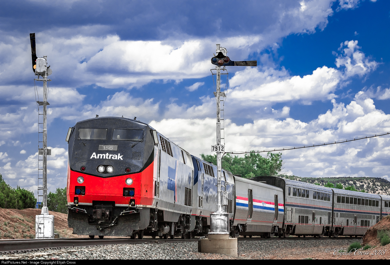 Running as advertised, Amtrak's westbound Southwest Chief splits the blades as it knocks down an intermediate pair of semaphore signals on this stunningly hot summer afternoon.