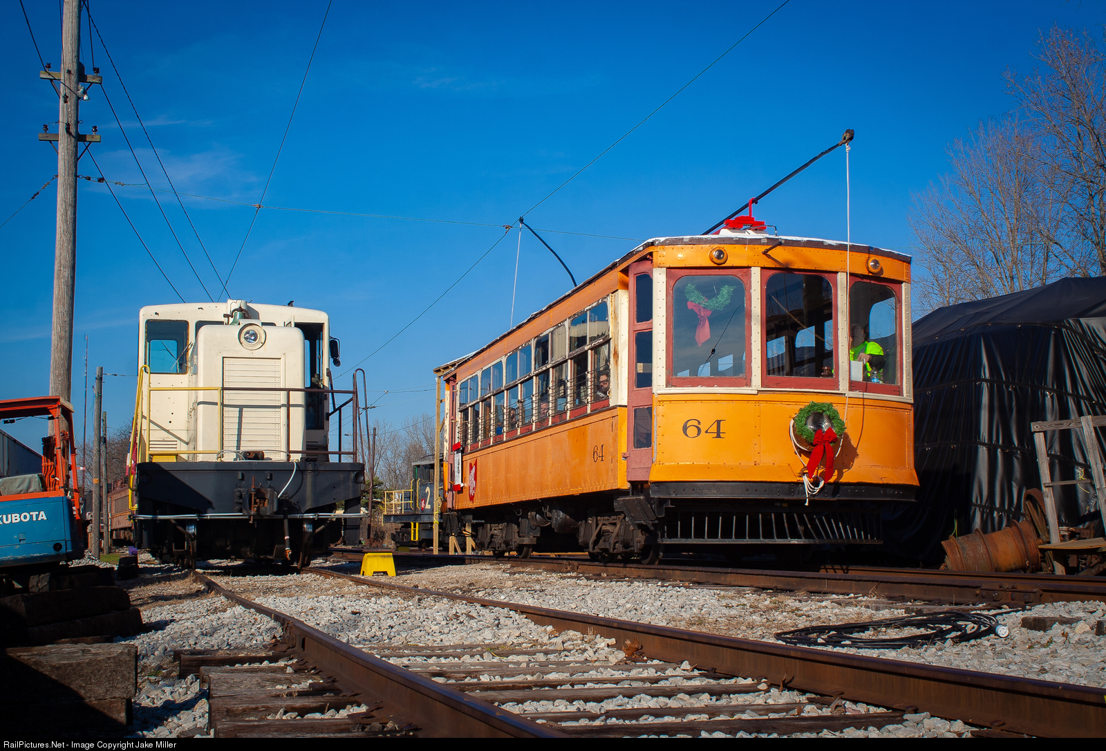 | Christmas in Worthington! Ohio Public Service Company interurban #64 leaves the Ohio Railway Museum's main yard for the last run of the day for the museum's Letters to Santa event. To the left is former US Army 65 tonner #7178, named "Roger" by the volunteers. |