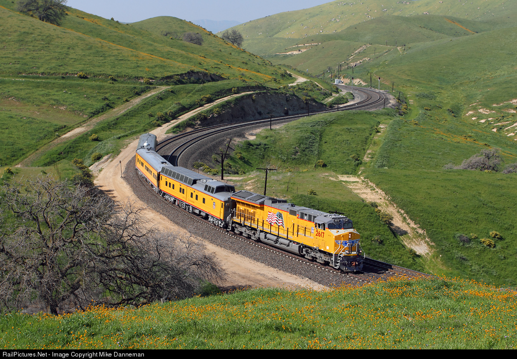 A southbound Union Pacific office car special climbs Tehachapi Pass at Bealville, California, on February 29, 2016. New GE ET44AC No. 2617 powers the short three-car train, with mobile laboratory UPP 210 leading business cars “Kenefick” and “Sunset.”