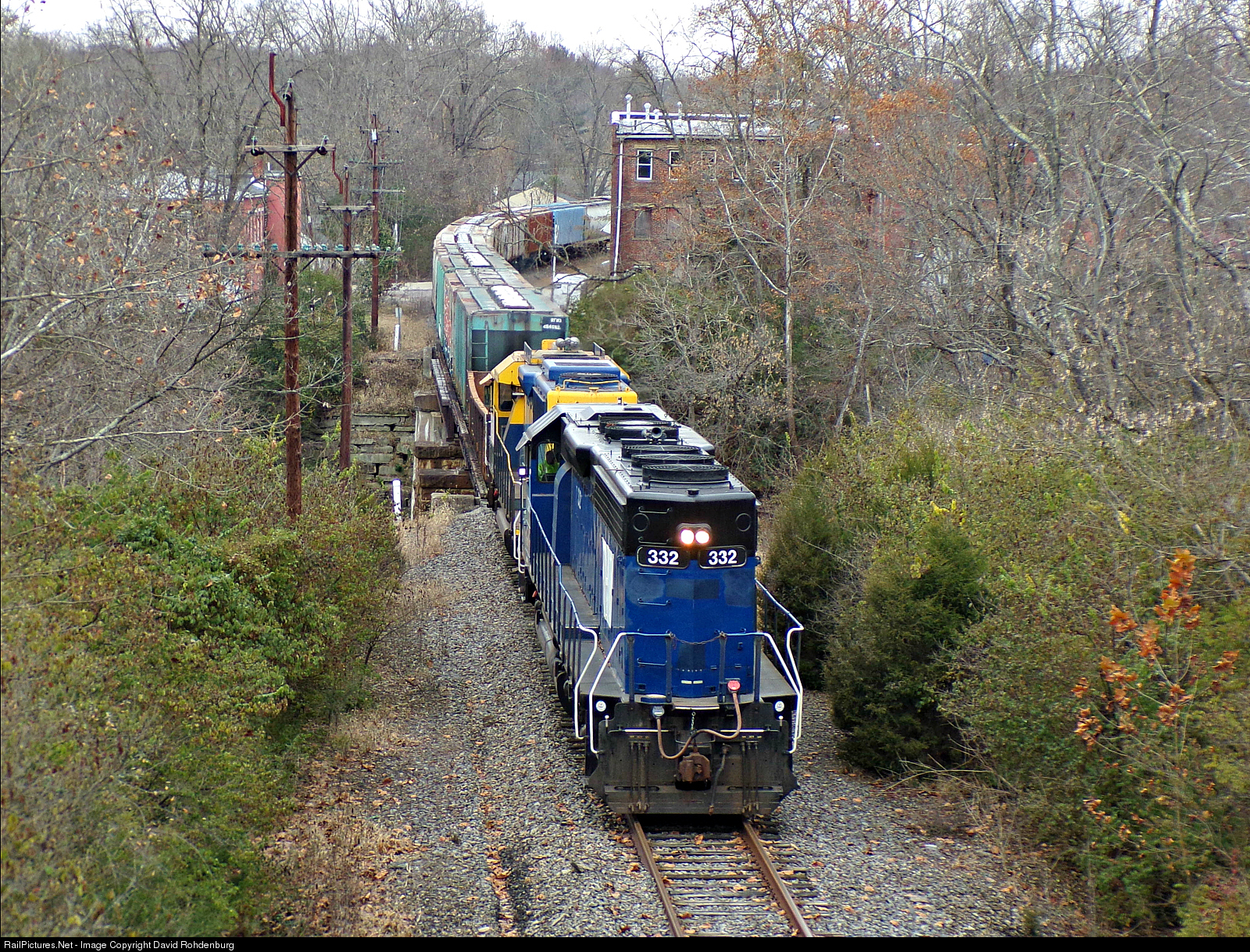 Former Montana Rail Link SD45-2 332 leads an eastbound Cincinnati Eastern Railroad freight across the East Fork of the Little Miami River at Williamsburg. The blue EMD running Long Hood Forward almost recalls the days of "Pevler Blue" Norfolk & Western units powering trains on this line, the former N&W "Peavine".