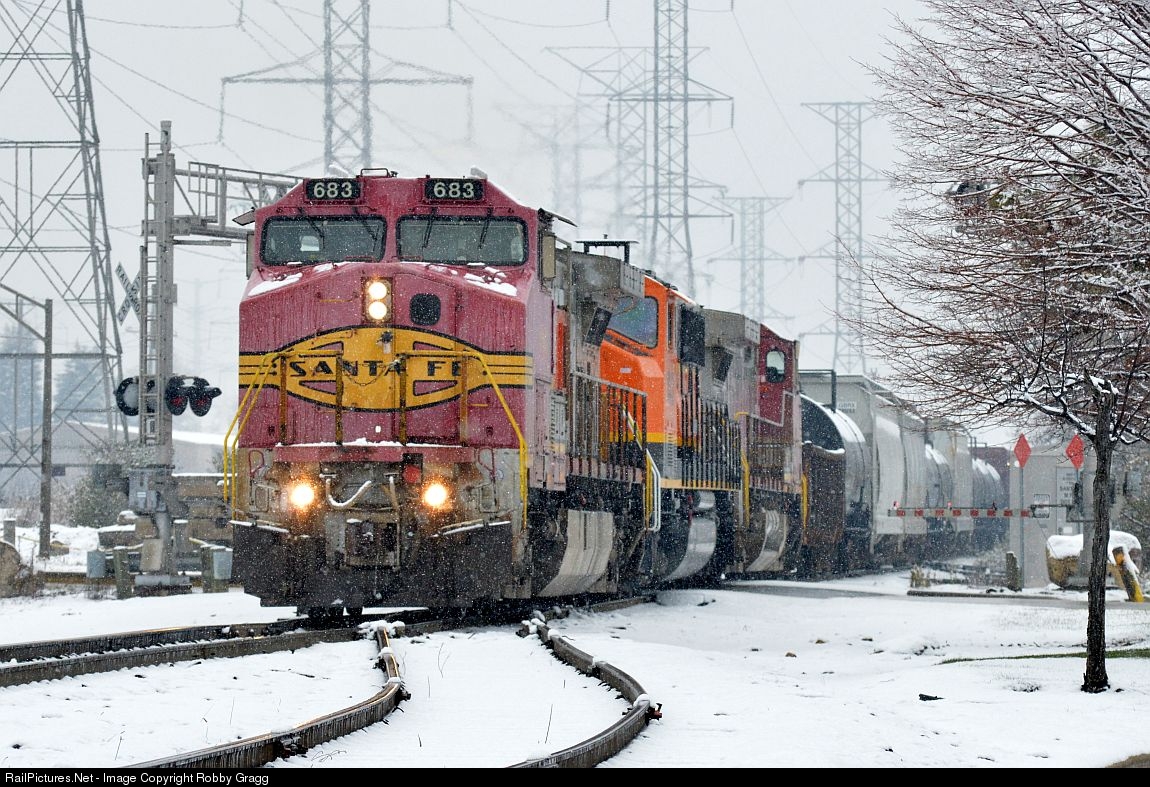 In some early season snow, Santa Fe Warbonnet 683 leads a local from the BRC into GM yard.