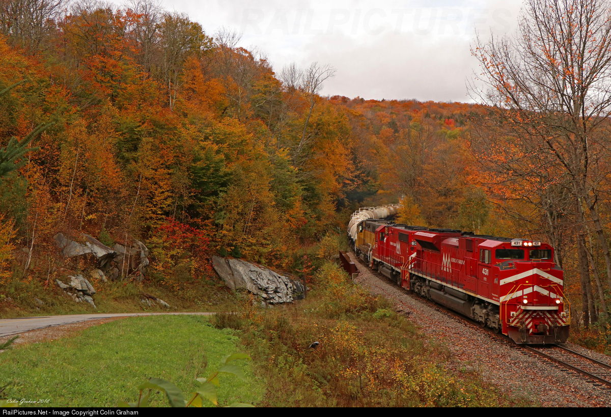 | Slippery autumn rails of the Green Mountains have brought out the big guns...one of VTR's two SD70M-2s leads two other VTR locomotives down the grade just outside of the Okemo Ski Resort, passing the vibrant fall colors surrounding it. |