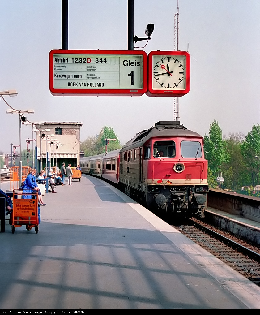 The Deutsche Reichsbahn 132 129 is arriving at the Zoologischer Garten station in West Berlin with the express train D 344 to Hoek van Holland.
