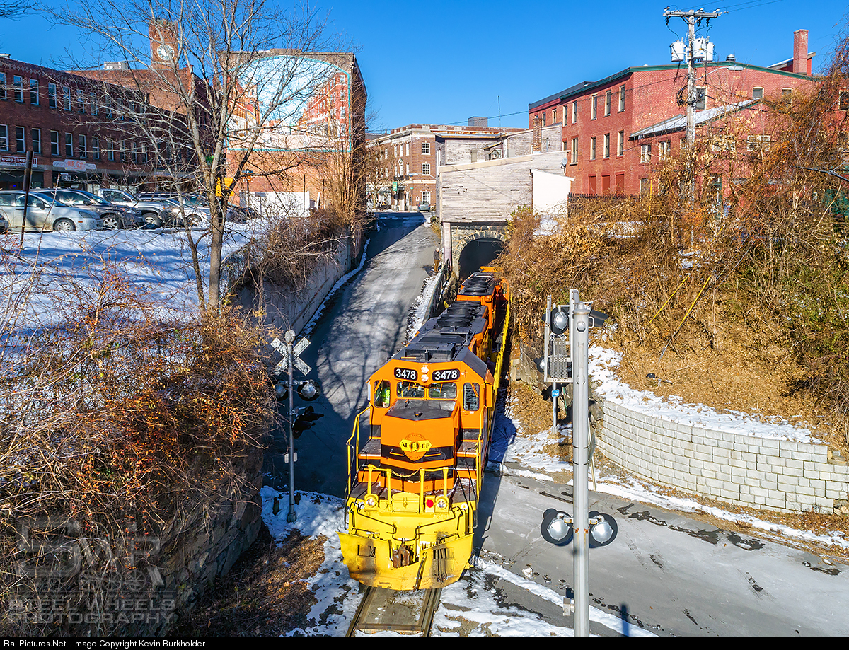 A late running NECR 324 exits the tunnel under the Village of Bellows Falls, Vermont, on the way from St. Albans, VT to Palmer, Massachusetts. Led by a quartet of rebuilt SD40/45 variants, the orange and black is pristine against the brown and white landscape.