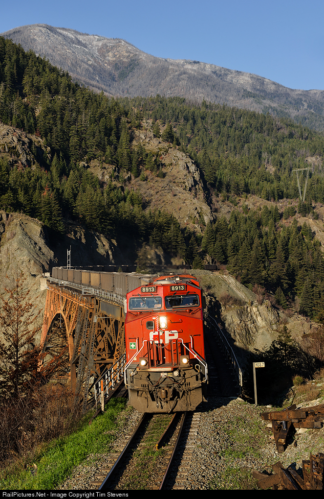 | CP ES44AC 8913 leads a loaded coal train over the Cisco Bridge across the mighty Fraser River, and its home road's Thompson Sub. In the Fraser Canyon, CP and CN run west on CN's mainline and run east on CP's mainline. Taken by an employee. |