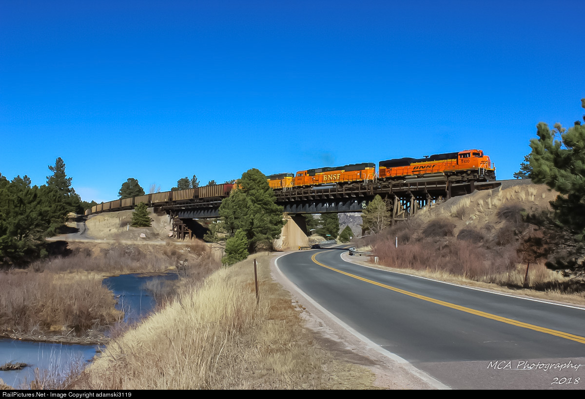 The class unit of the BNSF 9100 series leads a southbound coal load over the Santa Fe bridge in Larkspur, Colorado.