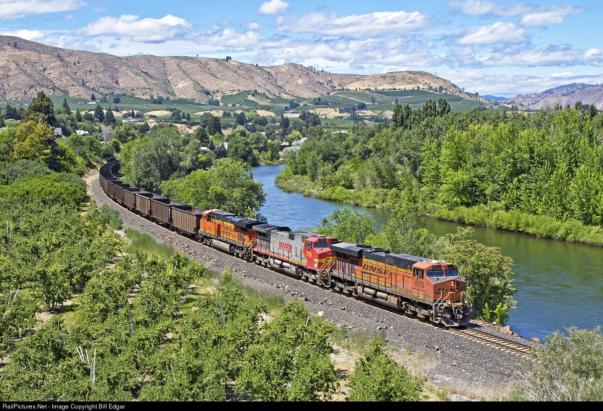 | A dusty BNSF 6175 leads a couple of cleaner GEs around Monitor curve several miles west of Wenatchee, WA. The empty coal train is completing its trip from Everett as it descends through the apple and pear orchards of the Wenatchee River valley. |