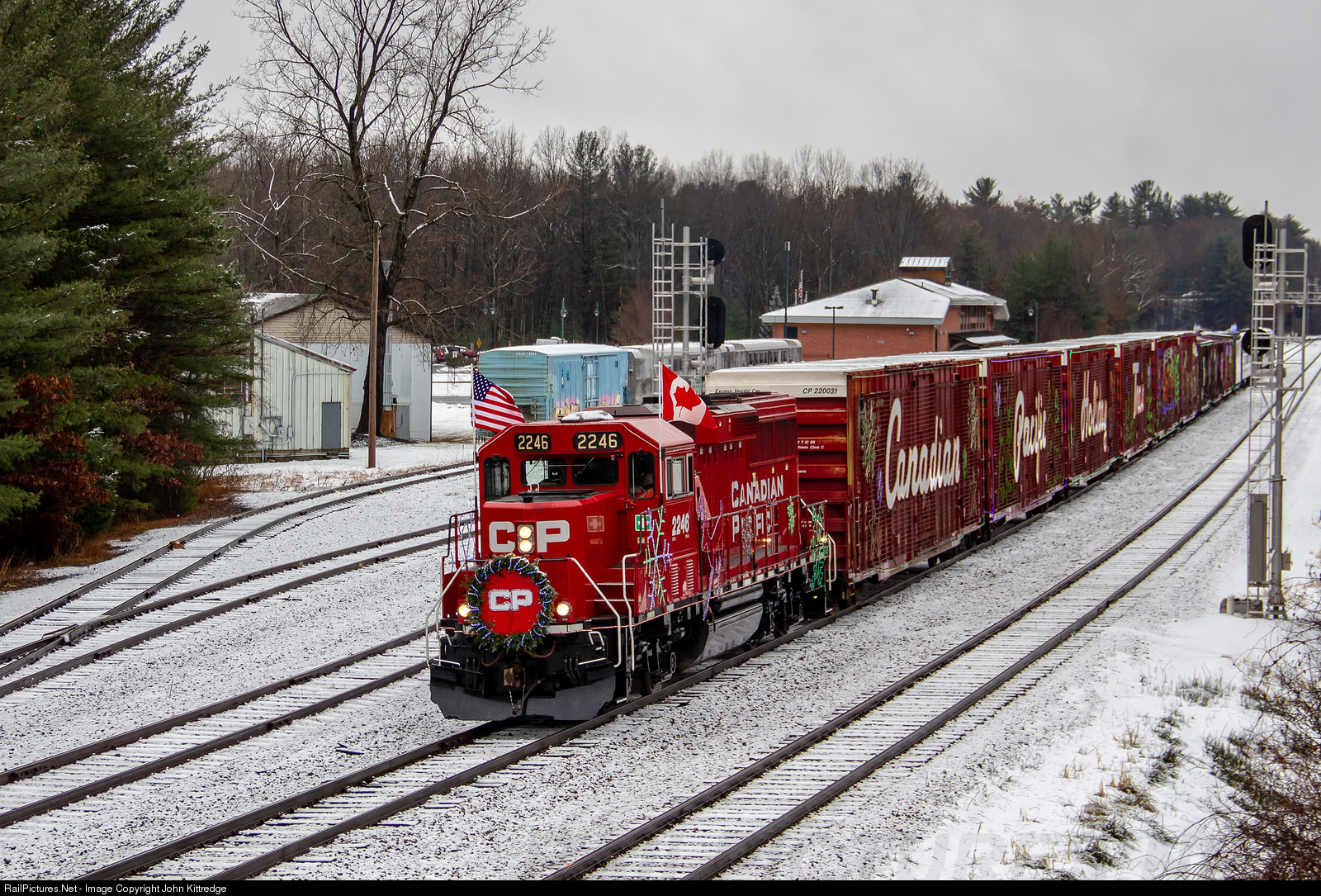 | Canadian Pacific 2246, a GP20C-ECO is in charge of this year's Holiday Train as it accelerates out of Saratoga Springs headed for its first stop of the day at Fort Edward, NY |