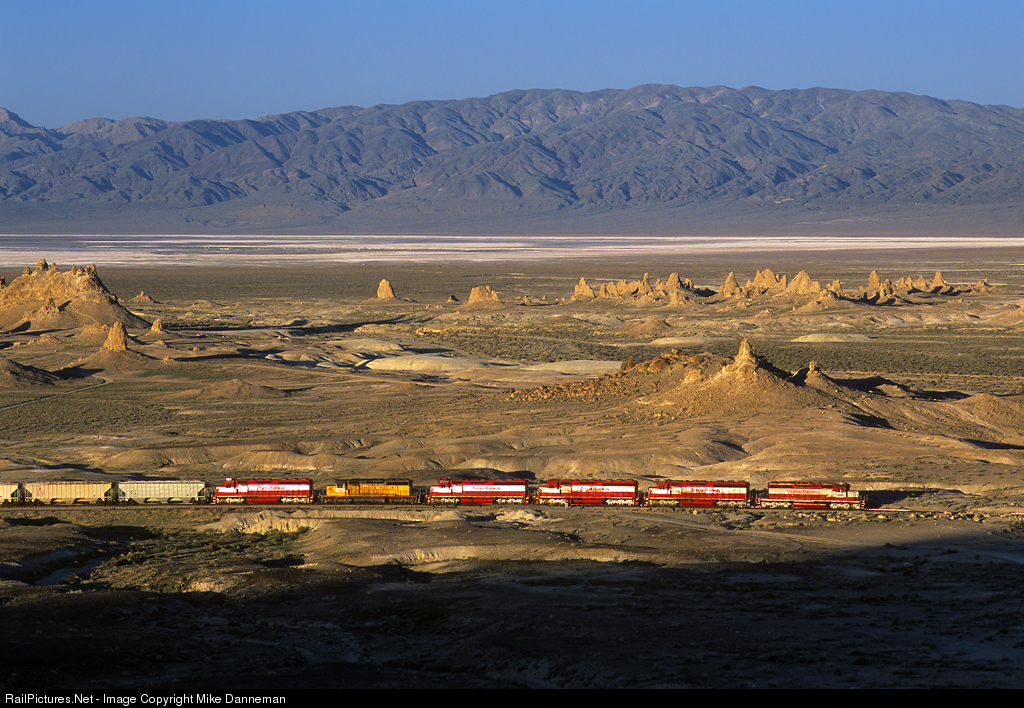 Climbing through the fascinating Trona Pinnacles sprouting up out a dry lake bed in the harsh desert south of Searles Valley, a Trona Railway freight rumbles toward the Union Pacific connection at Searles, California, on March 15, 2004. Powering the train is six EMDs—a pair of SD40-2s and four SD45-2s (rebuilt and now classed SD40-2s)—Nos. 3007, 3002, 3001, 3004, 2006 still in UP colors and 3005.
