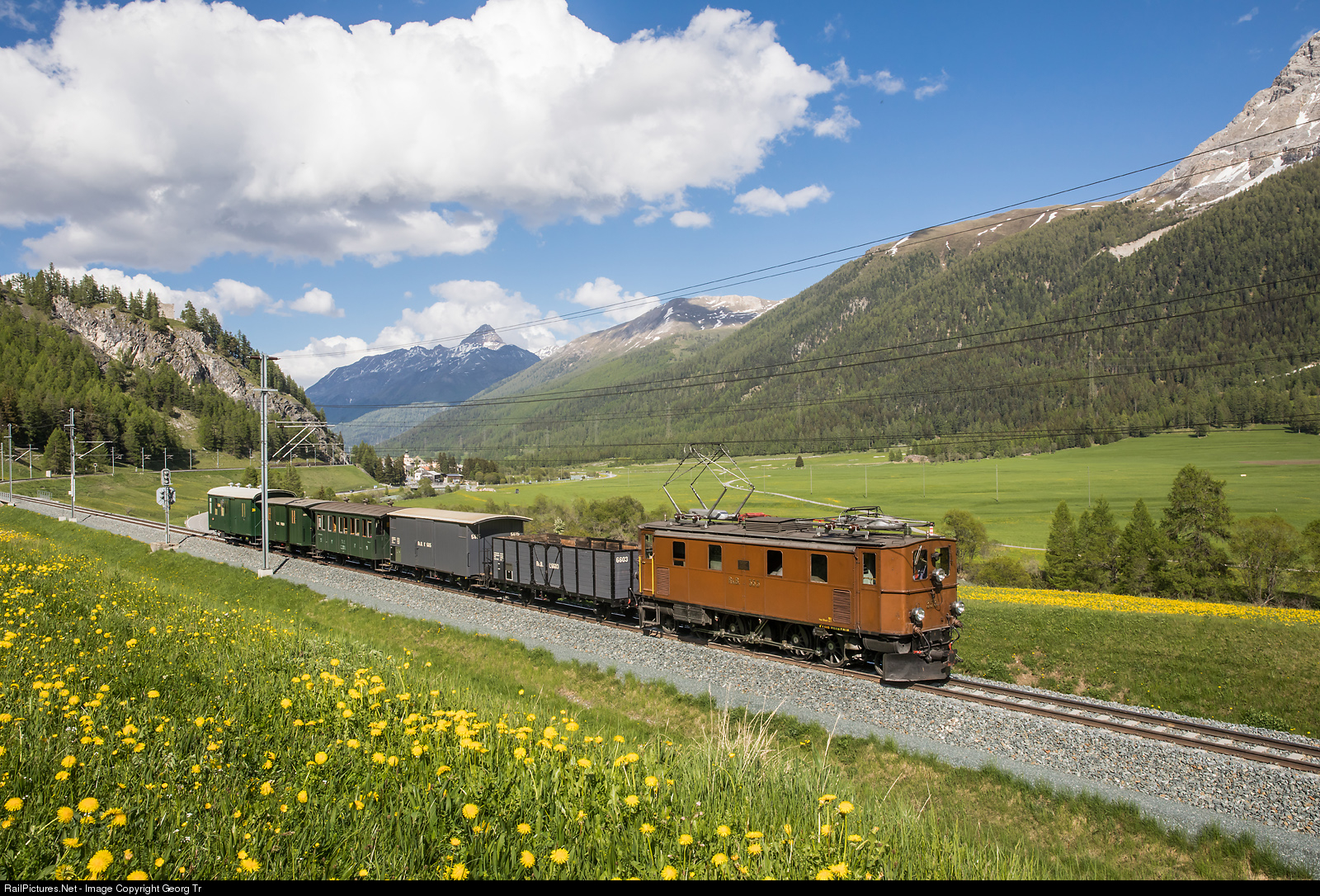 Ge 4/6 # 353 of the RhB, built in 1914 by SLM and MFO for the Engadine line, is pulling a mixed passenger and freight train between Madulain and La Punt-Chamues-ch, with Piz d'Esan in the background. This was a privately organised RM photo charter train. The cars are all renovated by members of "Club 1889" in the past years. From the rear: Mail car Z # 26 from 1913, baggage car F # 4004 from 1896, third class passenger car C # 2012 from 1889, covered freight car K # 5615 from 1913, open freight car L # 6603 from 1911.
