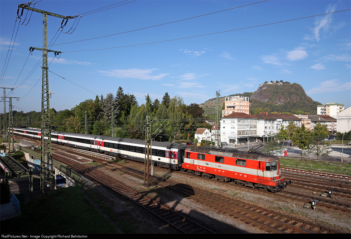 | Re 4/4 II 11108 and 11109 have still the Swiss Express paint scheme. Locomotive 11109 arrives in Singen with IC 282 Zürich - Stuttgart. |