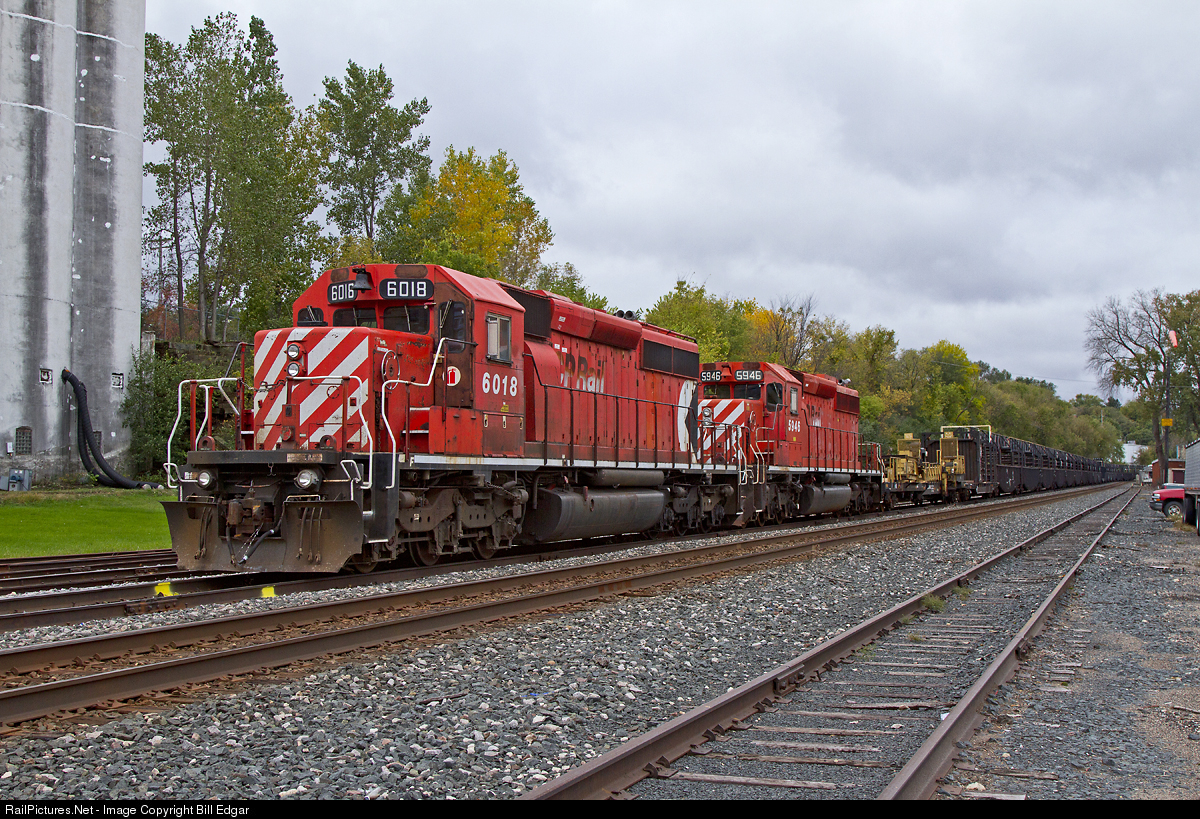 | CP 6018 and 5946 layover at Red Wing, MN with their rail train. Looking a little worse for wear, the 6018 still sports the CP Rail 1980s scheme including the multi-mark logo on the rear of the hood. 5946 represents the changes made around 1986-87. That mulit-mark is what made the Action Red scheme great, CP has been just a dip job ever since. |