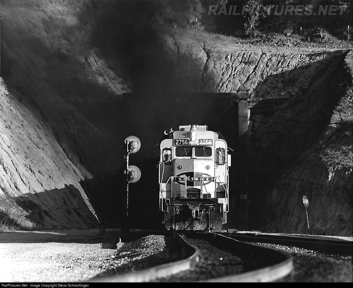 | Santa Fe 2756 East emerges from tunnel 5 with her diesel exhaust billowing skyward. The freight is fighting a heavy grade and almost constant curvature. It was not unusual to see GP30s on the point of Santa Fe road freights, even on Tehachapi. The carrier used a fleet of four-axle EMDs to shuttle freight between Barstow and Bakersfield. |