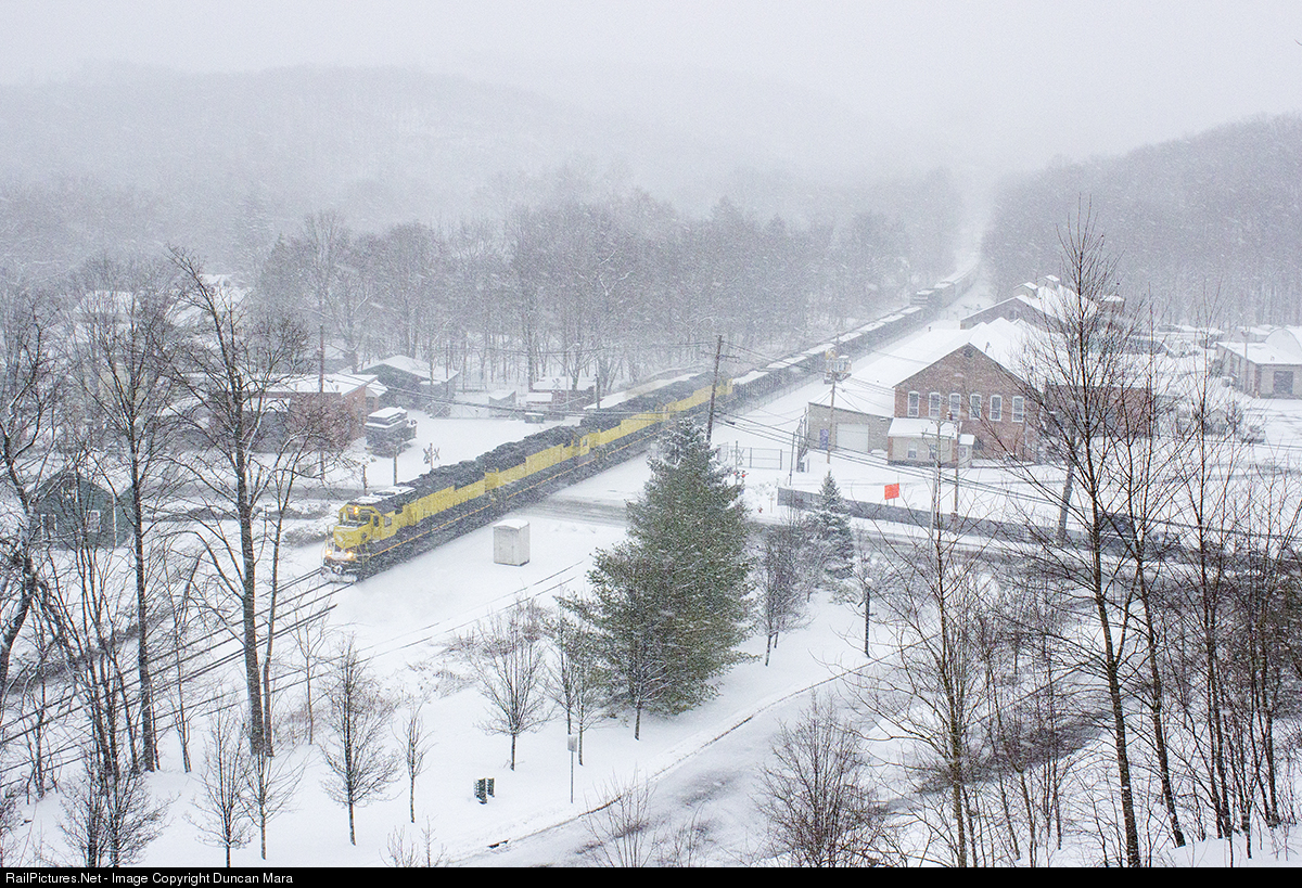 NYS&W SU99 charges through snowfall caused by one of many nor-easters which hit the Northeast U.S. this early Spring season. The train begins to climb the grade towards Sparta Mountain; crossing Mathews Ave in Riverdale, NJ. By this point, the 4 EMDs are already working hard to conquer the hill.