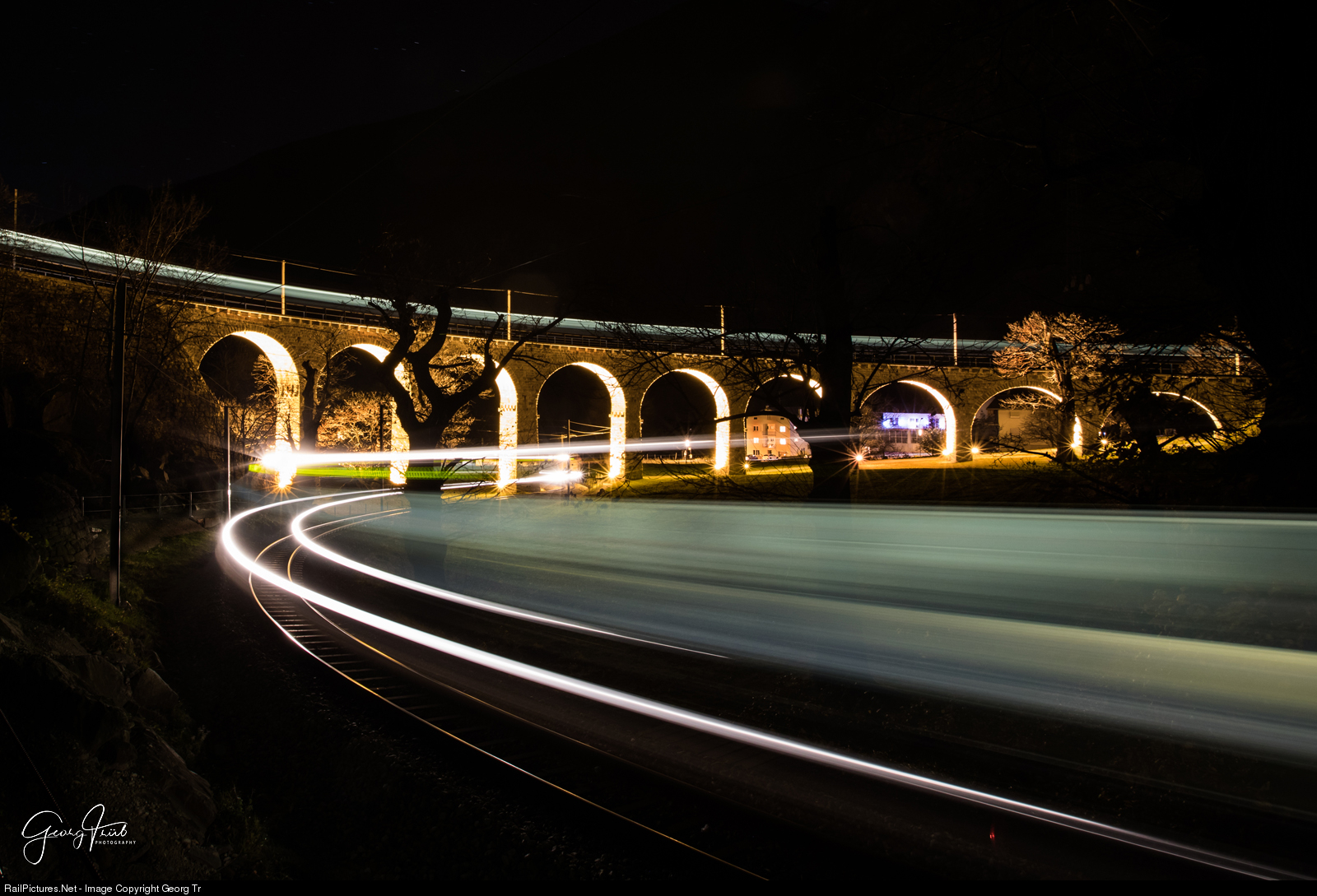 At 7.13 PM, the second last train of the day, "Allegra" ABe 8/12 # 3514, pulling two empty freight cars for log, is running through the spiral of the Brusio viaduct from Tirano to Poschiavo (and further to Pontresina-Landquart). A 66 second exposure. The viaduct has 9 arches of 10 meter span width and is 142 meter long, the hight is between 7 and 17 meter. From Poschiavo, this railcar is running as freight # 5676 over the Bernina pass to Pontresina, then as freight train # 5378 via Samedan-Vereina to Landquart, where it will arrive around 11 PM, to ran a service on the Arosa line the following day.