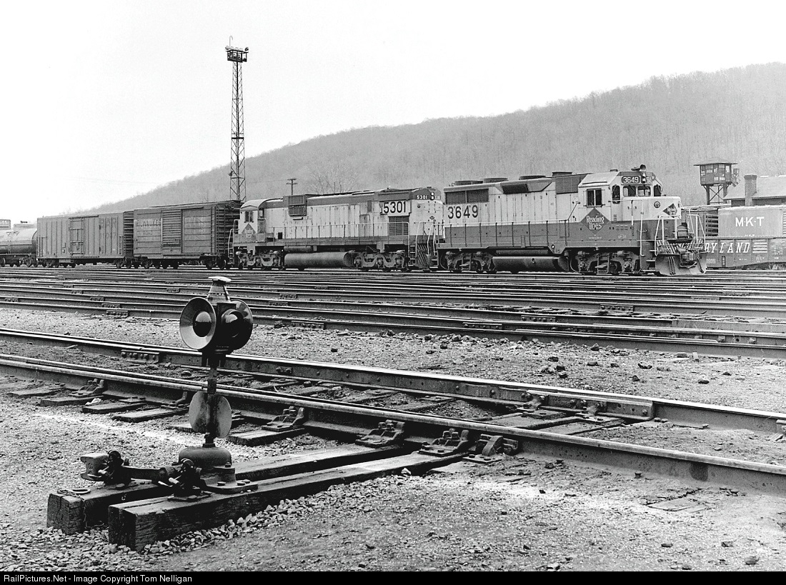 A westbound Reading freight behind a GP35 and a Century 630 prepares to leave the RDG/CNJ yard at Allentown, PA, on a misty spring day. This train was bound for the railroad's namesake city of Reading, PA, then likely on to either Rutherford (Harrisburg) or Philadelphia.