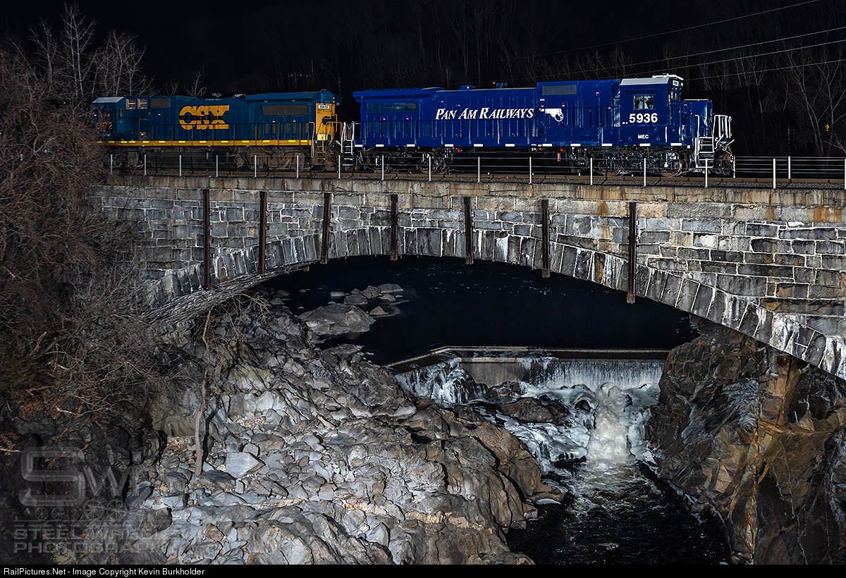 Pan Am Railways’ latest repaint, ex-CSXT 5936, is seen on its debut leader trip crossing the Bellows Falls on the GMRC Bellows Falls Subdivision, which PAR utilizes trackage rights over. MEC 5936 is set up with full compliment of ACSES/PTC and cab signal equipment for use on the Amtrak Springfield Line to reach Plainville, CT.