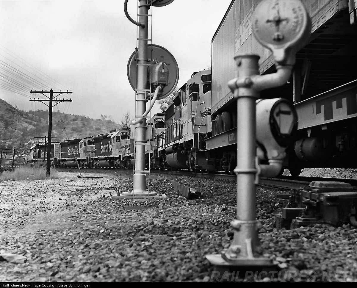 An eastbound ATSF pig roars past the trackside indicator at the east end of Woodford and heads for the 4th crossing of Tehachapi Creek. Before the widespread use of radio communication on the SP, its famous train indicators with a mini semaphore behind glass, were ubiquitous.