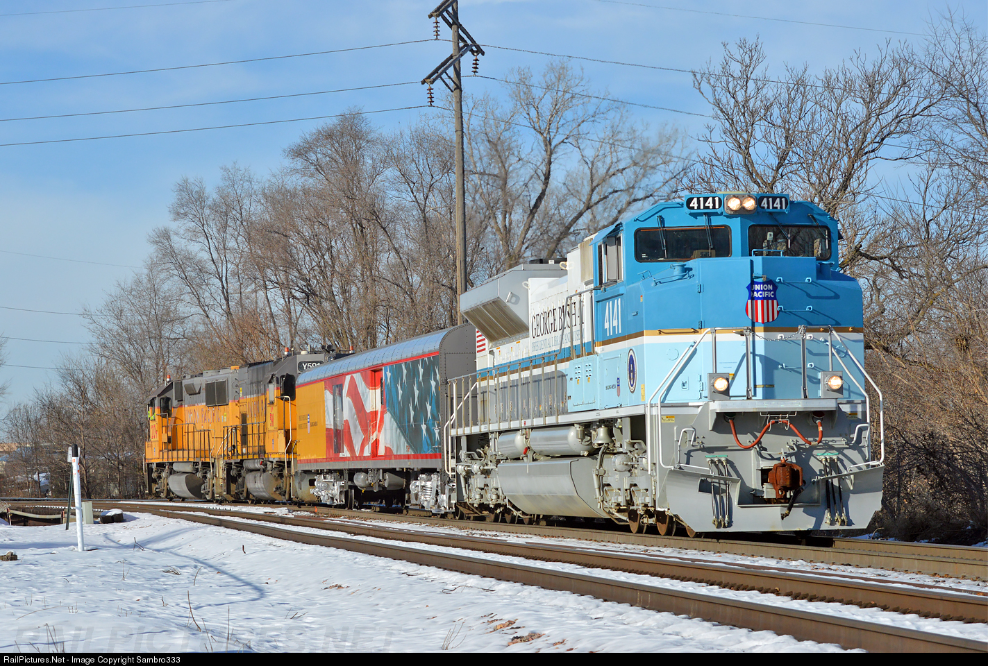 Union Pacific placed UP 4141 on public display in downtown Omaha, NE from December 9th-12th. On the afternoon of December 12, 2018, 4141 was pulled from the display track. To get back on UP rails, two geeps shoved 4141 and the baggage car through BNSF's Gibson Yard, then pulled the consist uphill with 4141 in the rear. Luckily for us railfans, the crew in 4141 left the headlights on, making it look like it was leading. It is seen here nearing the Omaha Amtrak Depot, where it will take the transfer track from the BNSF onto Union Pacific.
