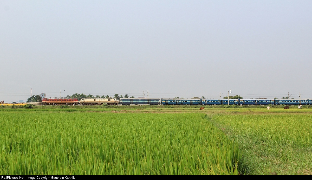 Erode WAP-4 tows a dead Royapuram WAP-7,which has failed en route powering Andaman express from Katra to Chennai through the lush green fields of Gummidipoondi.