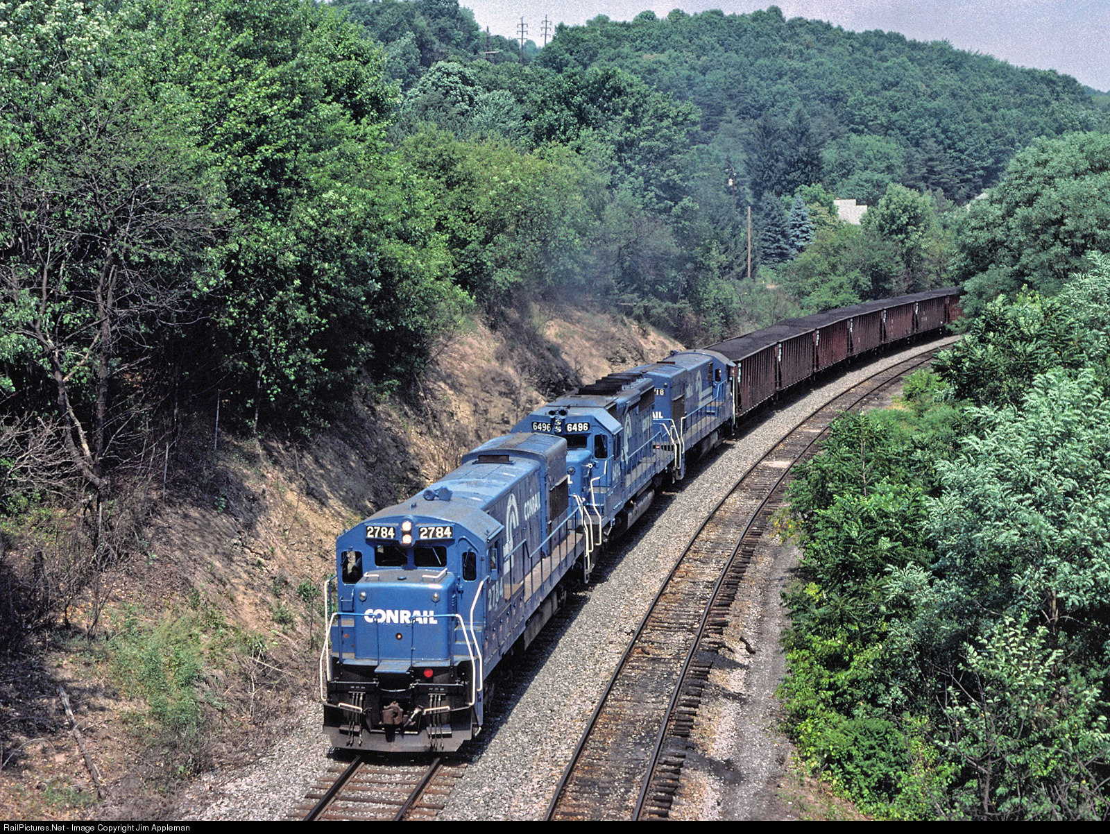 Ex-Lehigh Valley 508 leads this loaded coal train north to New York state on Conrail's Corning Secondary. Within three months the last through trains would travel between Williamsport, PA and Corning, NY on this line through Pine Creek Valley and the "Grand Canyon of Pennsylvania".
