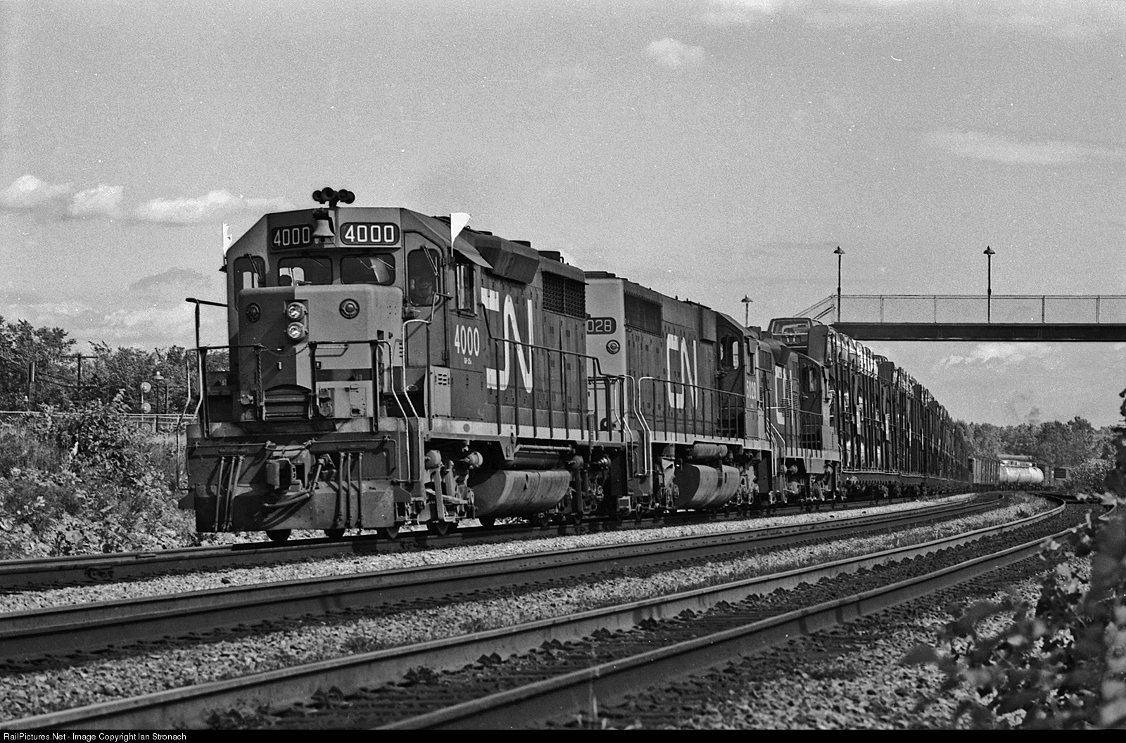 | One of CN's two GP-35's leads a westbound freight out of Montreal Yard (now Taschereau Yard) and up the short grade at Lachine. This grade is the result of a new track alignment that was built as part of the hump yard that opened in 1960. The pedestrian overpass lead to the now moved CP Lachine Lakeshore commuter train station. |