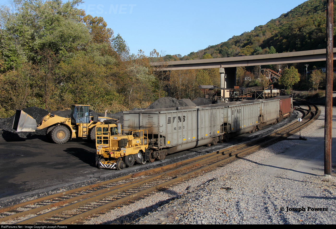 | Mountain Energy Resources Trackmobile Model 4200 has just pulled five empty coal gondolas past the small loader in Norton, Virginia. |
