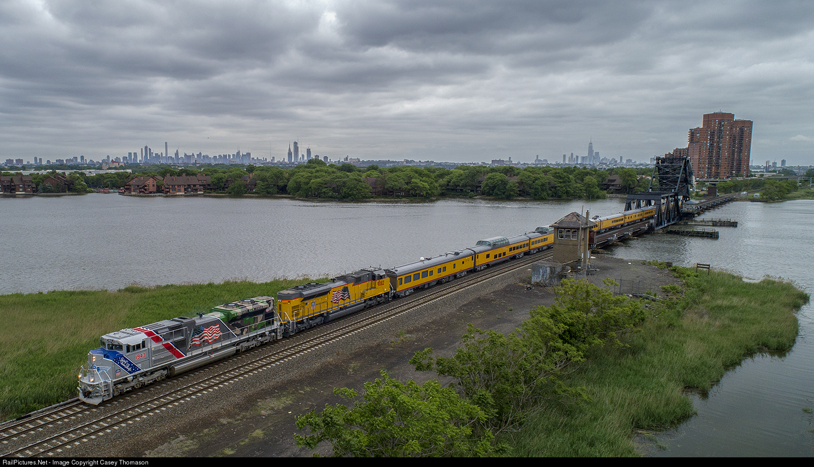 UP 1943 leads NS train 066 across the Hackensack River at HX tower, leaving Croxton for a special trip to Harriman, NY, along the NJ Transit/ Metro-North.