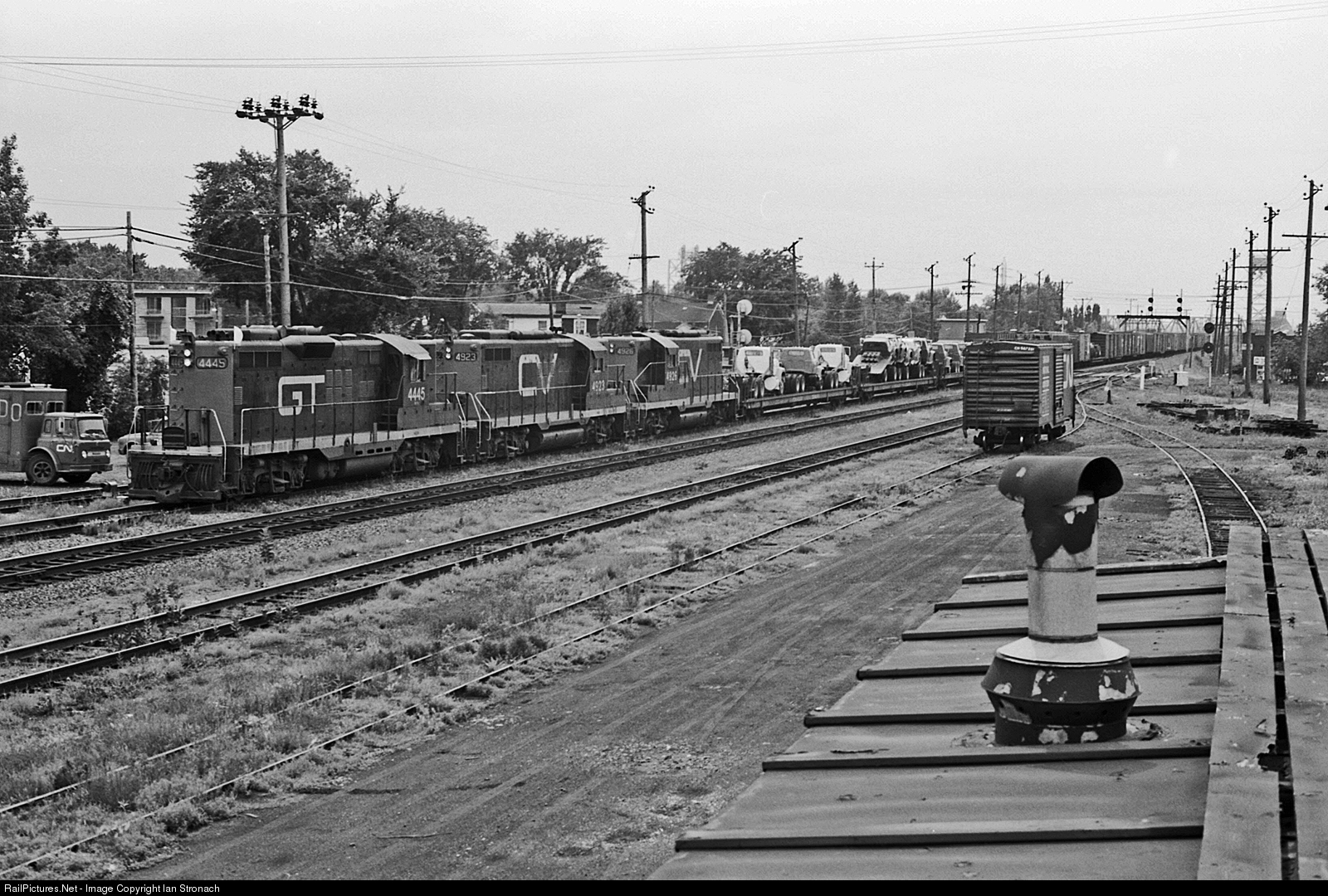 Three GP-9's head up the daily Canadian National-Central Vermont freight from Montreal to St. Albans, VT. Despite the GT markings the lead unit is assigned to the CV. Units regularly were swapped amongst CN's American subsidiaries - the CV, GTW and DW&P. The tail end of the train is still on the Victoria Bridge, which was opened to rail traffic in 1859 and today, 160 years later still carries CN trains across the St. Lawrence River.