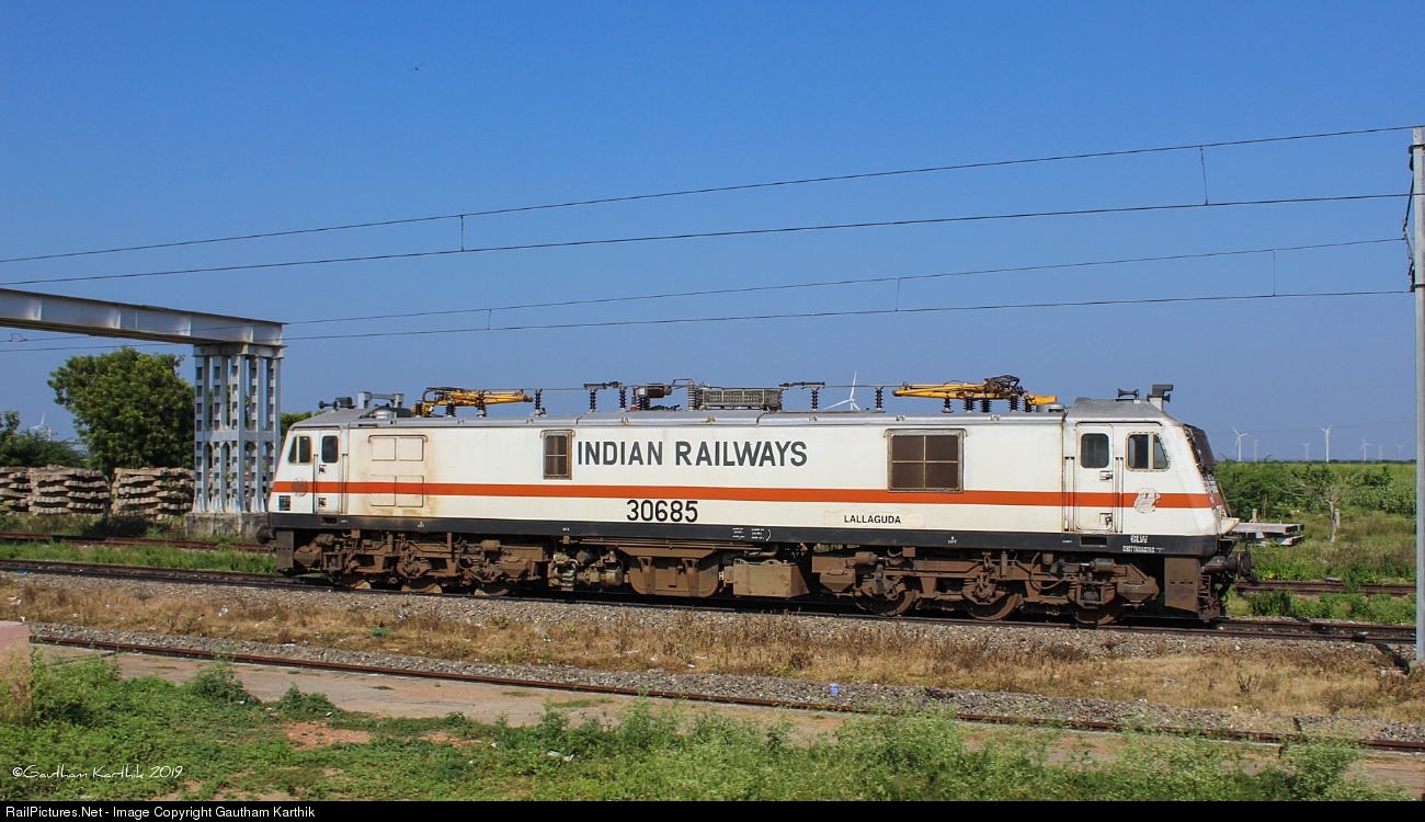 Lallaguda WAP-7 #30685 which brought Tuticorin-Maniyachi link express in the morning, rests in the sidings of Maniyachi Jn,all alone,surrounded by barren lands and windmills,and watching trains pass through till it powers the Maniyachi-Tuticorin link express in the evening.