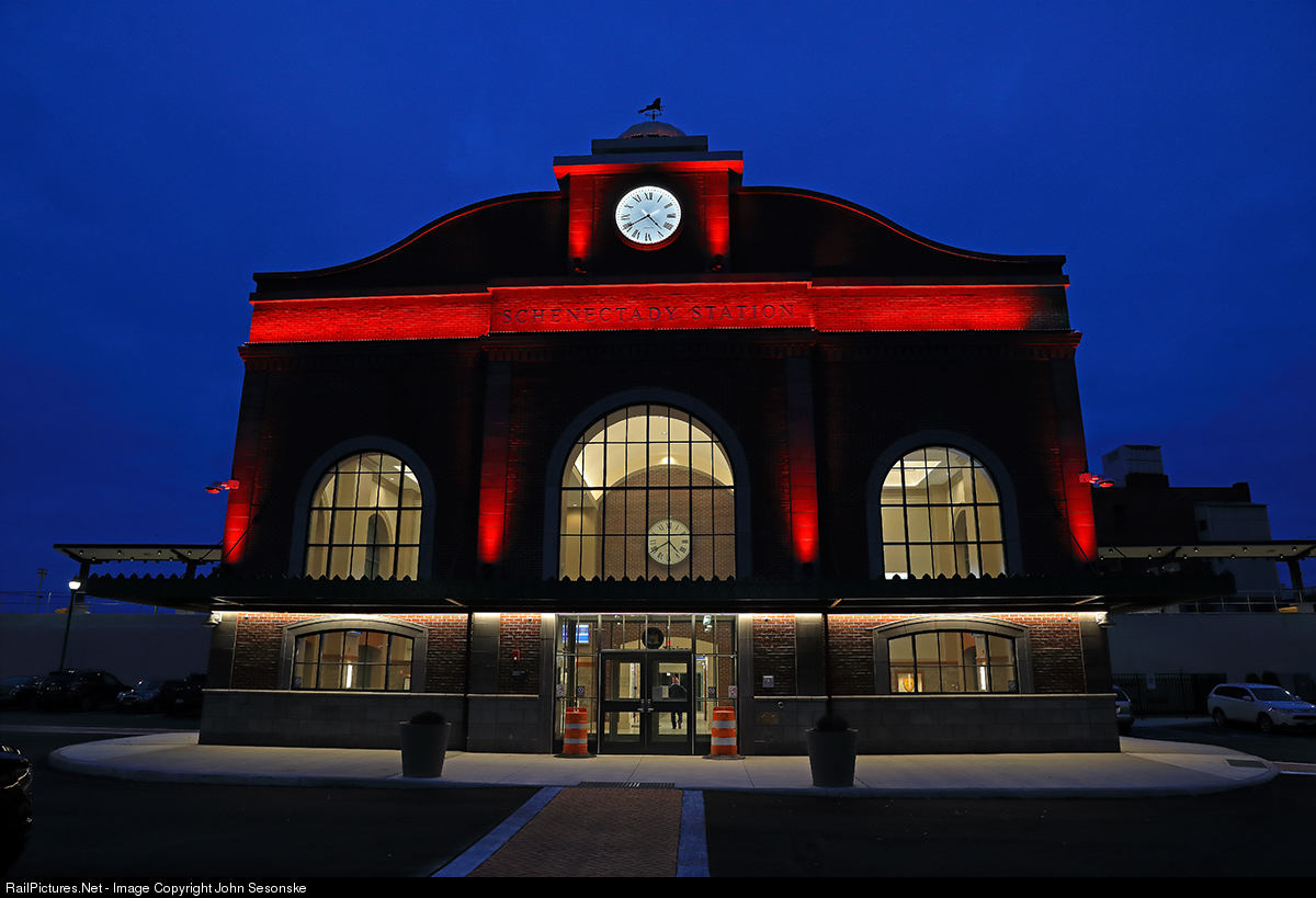 | The new Schenectady Amtrak station shows off it's Christmas colors during the blue hour 2 days prior to Christmas. The new station opened on October 17, 2018. It is styled after the classic original 1908 New York Central station that stood on this exact spot. That station was torn down in 1971 when service was moved to nearby Colonie. In 1978 a new 1970's style standard Amtrak style station opened in this spot when service returned to downtown Schenectady. |