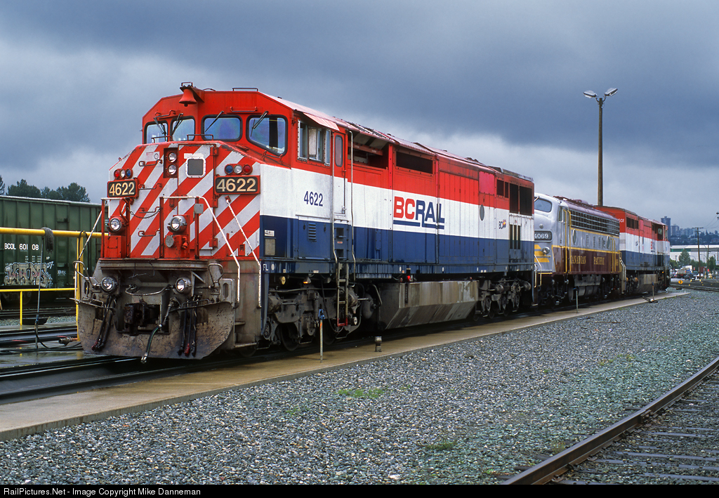 BC Rail (formerly British Columbia Railway) General Electric C40-8Mu Nos. 4622 and 4601 bracket the West Coast Railway Association’s Canadian Pacific GMD FP7 No. 4069 in the BCR locomotive facility at North Vancouver, British Columbia, on September 26, 2001.