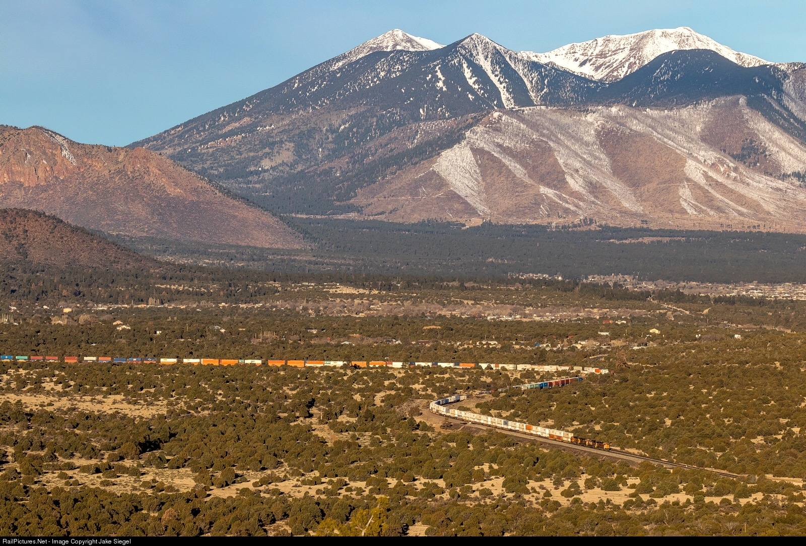 A BNSF intermodal twists through the long curves near Winona, Arizona.