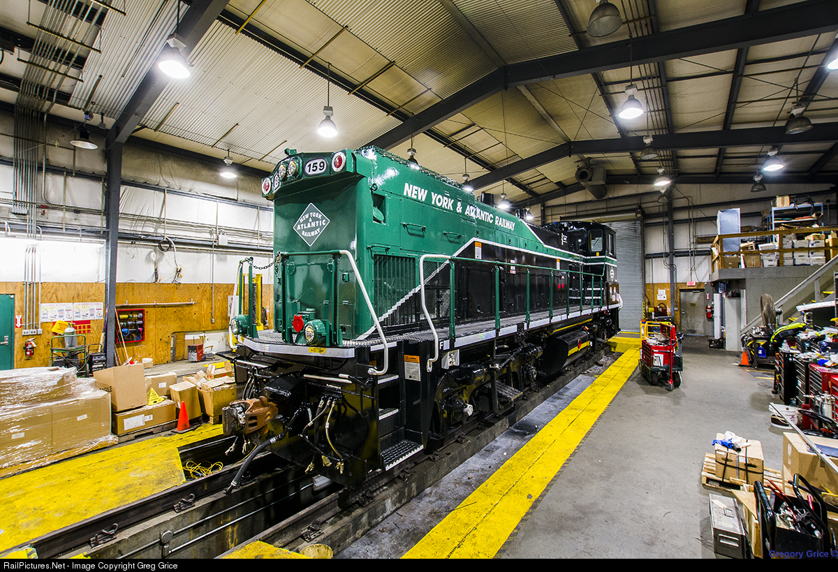 "NYAR 159, Rebuilt" New York & Atlantic Railway MP15AC 159 sits inside of Fresh Pond Shops awaiting electronics installation a couple days after returning from Altoona Works. 159 sat dormant in Fresh Pond Yard for a couple years before being purchased (unit was previously leased) and sent to Altoona Works for rebuild. 159 features a rebuilt Tier 0+ engine, newly refurbished cab with heating & air conditioning, a fresh paint job, new electronics and more.