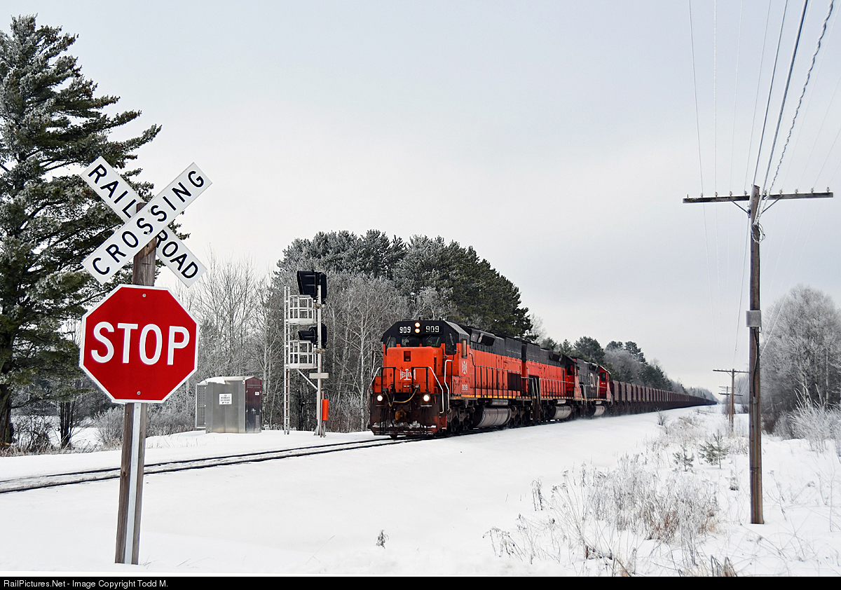 A trio of Bessemer and Lake Erie Railroad units (909, 904, 903) bring up 145 ore cars from Two Harbors to be loaded at U.S. Steel Minntac with approximately 15,000 tons of taconite pellets.